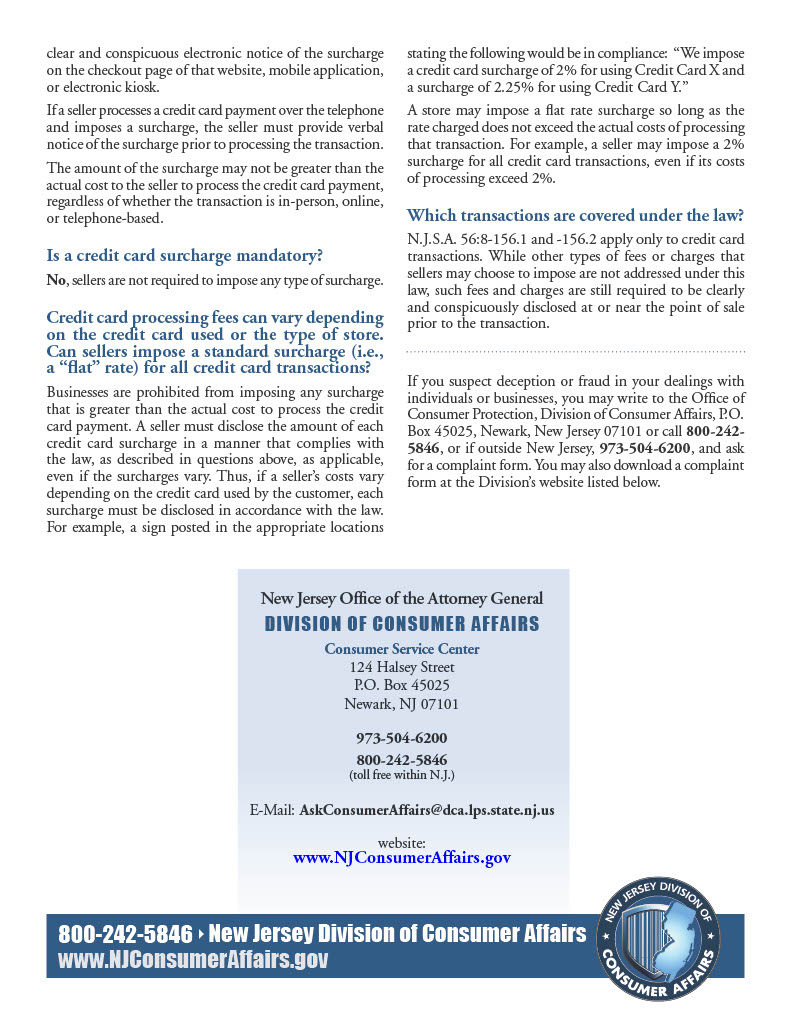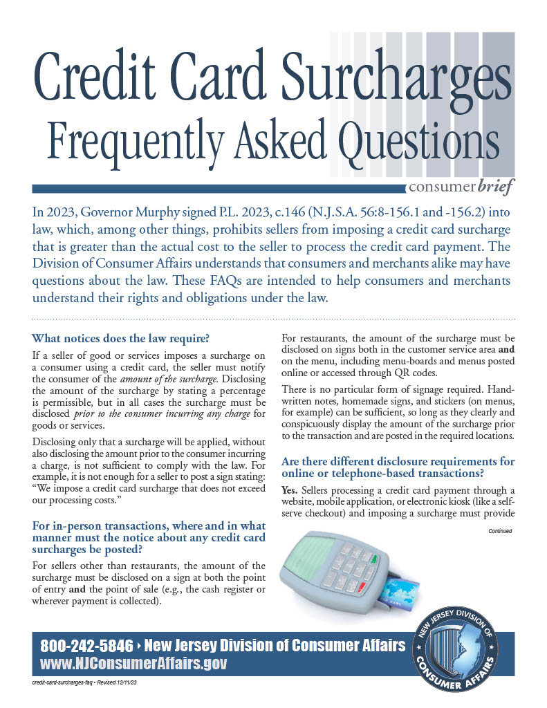 The New Jersey Division of Consumer Affairs prepared an FAQ surrounding the new credit card surcharge fee law: